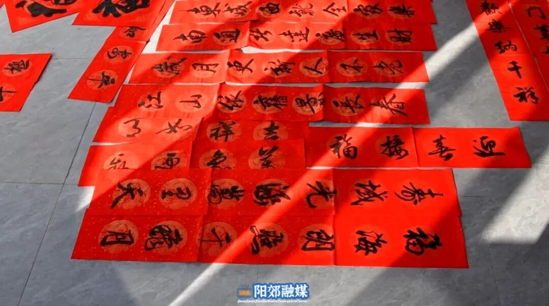 现场墨香四溢,书法爱好者们铺纸研墨、笔走龙蛇,将对新春的美好期许与祝福融入笔墨之中,一幅幅对仗工整、笔力遒劲的春联跃然纸上。村民们有序排队,挑选心仪的春联内容,现场气氛热烈。志愿者们还主动协助铺纸、晾晒春联,贴心服务让群众倍感温暖。
